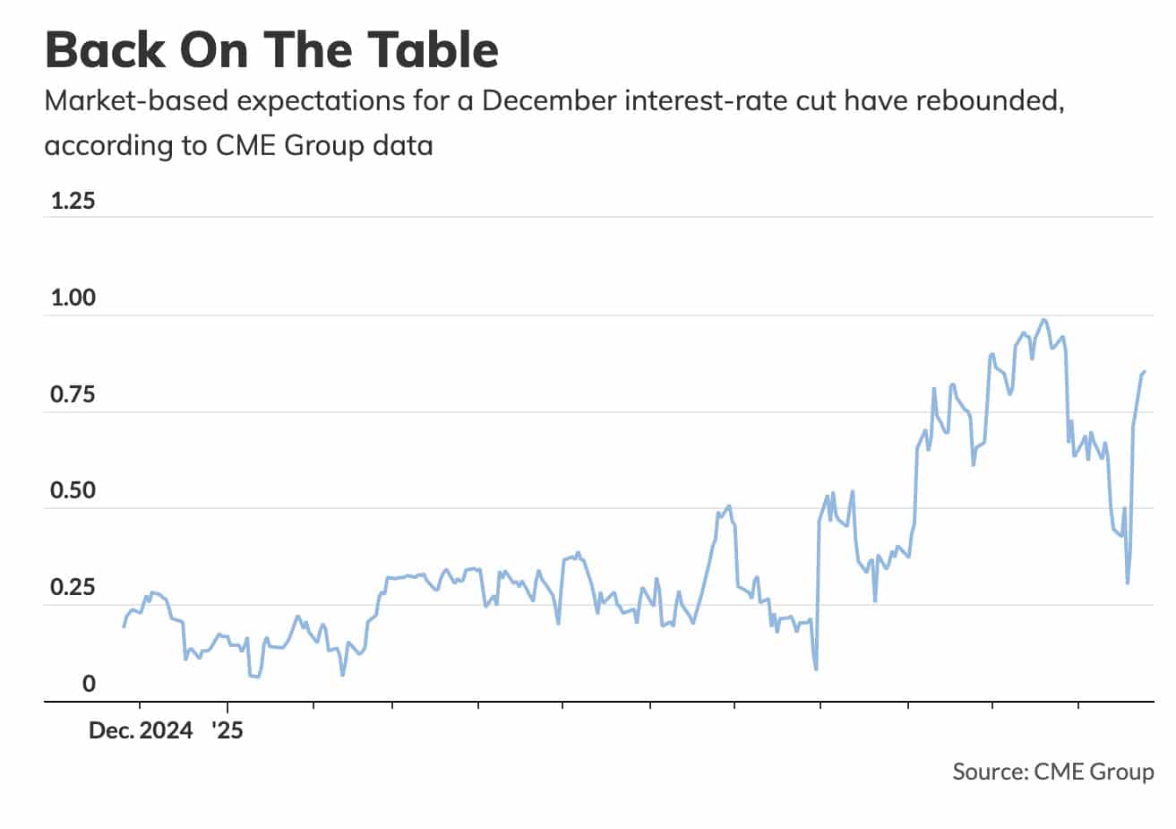 The US has entered December with markets expecting a rate cut, despite an unusual data gap caused by the longest-ever government shutdown. The October CPI and jobs reports were cancelled, leaving the Fed to set policy with limited new inflation information. Still, Fed funds futures show a 90% chance of a 25-basis-point cut in December, with markets increasingly expecting an easing cycle that could last well into 2026.