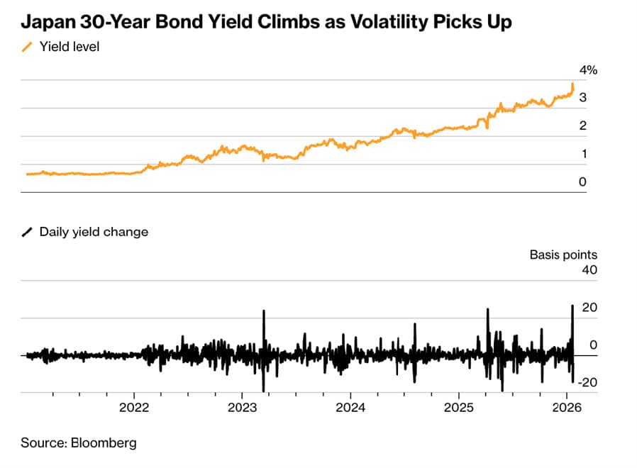 The JGB market saw yields rising at a pace rarely seen in Japan’s traditionally stable bond market. Thirty- and forty-year JGB yields moved to multi-decade highs above 4%, with the 30-year yield climbing more than 25 basis points in a single day, around eight times the average daily range of the previous five years.