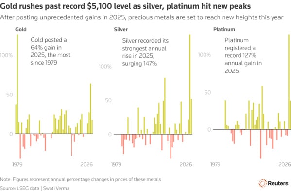 For most of the month, gold, silver, platinum and palladium moved sharply higher. Gold extended its multi-year bull market, breaking above $5,000 an ounce and briefly trading around $5,500, representing more than a 90% increase over the past 12 months. Silver’s move was even more pronounced, and prices broke through $100 an ounce for the first time and even exceeded $120, implying annual gains close to 300% at the peak. Platinum reached record levels near $2,900, and palladium advanced to its highest level in several years.