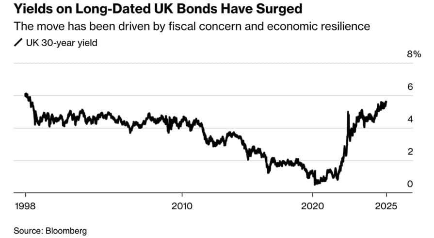 The dramatic rise in UK government bond yields in August highlighted pressure onBritain’s fiscal position and concerns about monetary-policy coordination. Ten-year gilts hit ~4.7% while thirty-year yields climbed to ~5.6%, levels likely to constrain government spending flexibility and signal investor wariness about the UK’s economic trajectory.
